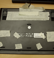 비닐까지 모두 제거한 하판 모습, 상판의 제어 보드와 키보드 부품의 외형이 물라스틱에 선명하게 찍혀 있습니다. 이